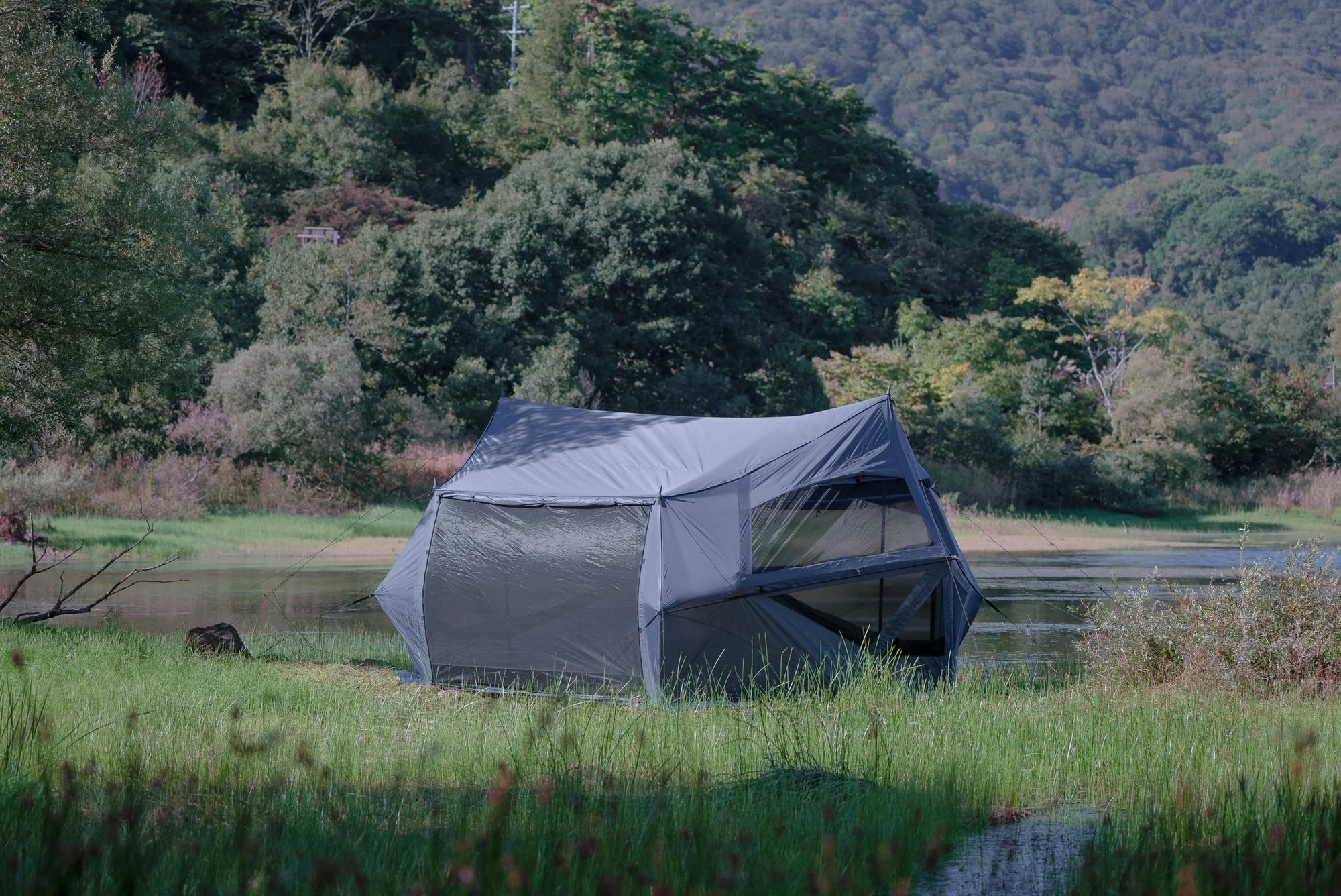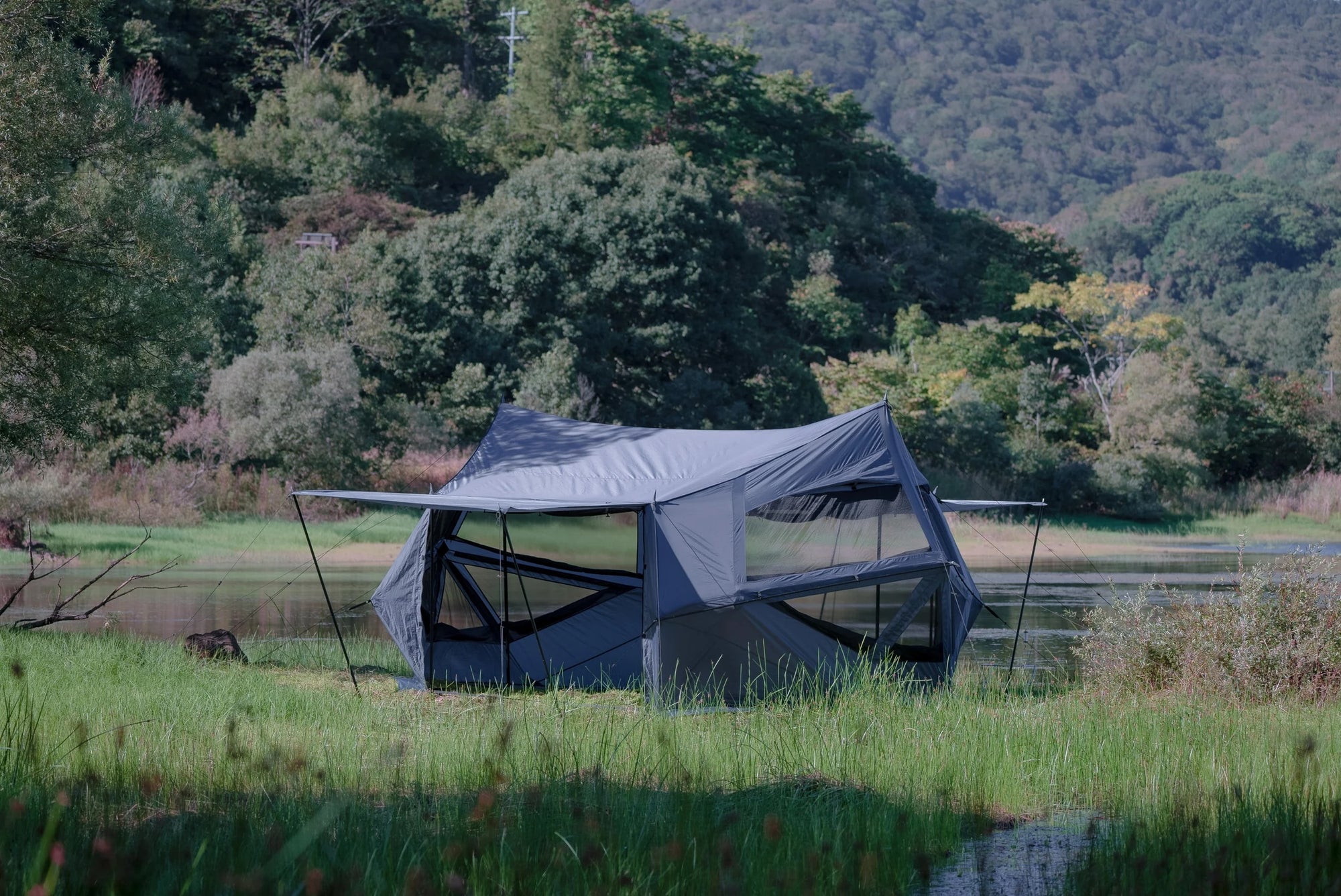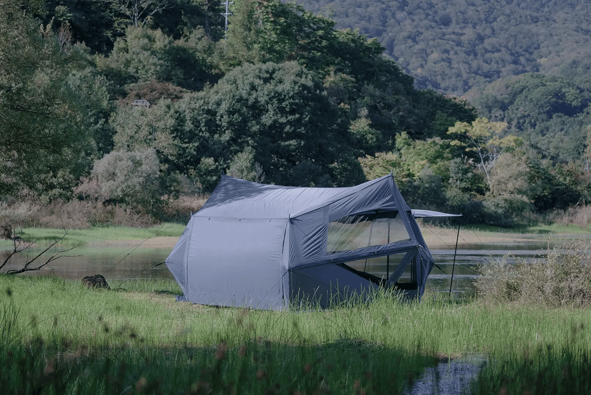 The TOKYO CRAFTS GRAHUS Shelter blends architectural form with functional design. High ceilings, outward-flared sides, and large windows create a spacious interior that feels open and connected to its surroundings. Built with durable materials, tested wind resistance, and practical details like adjustable panels, ventilation points, and an inner roof, the GRAHUS is designed for group camping in all seasons.