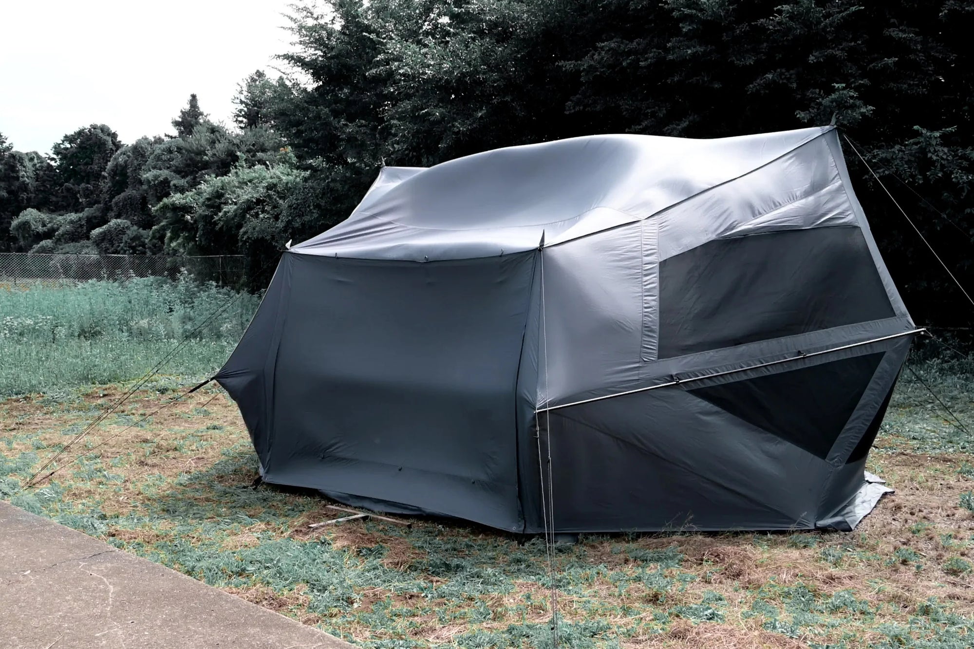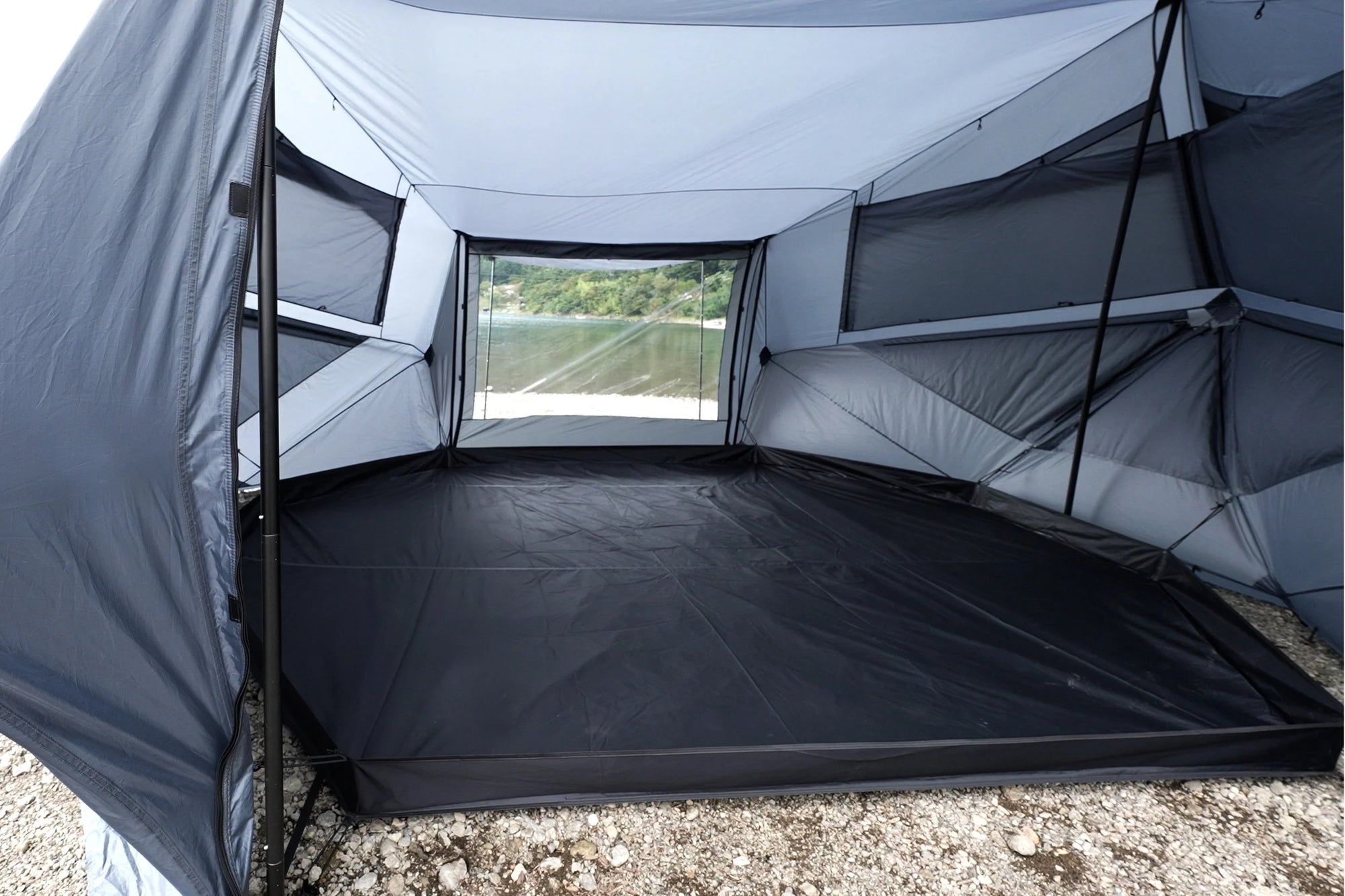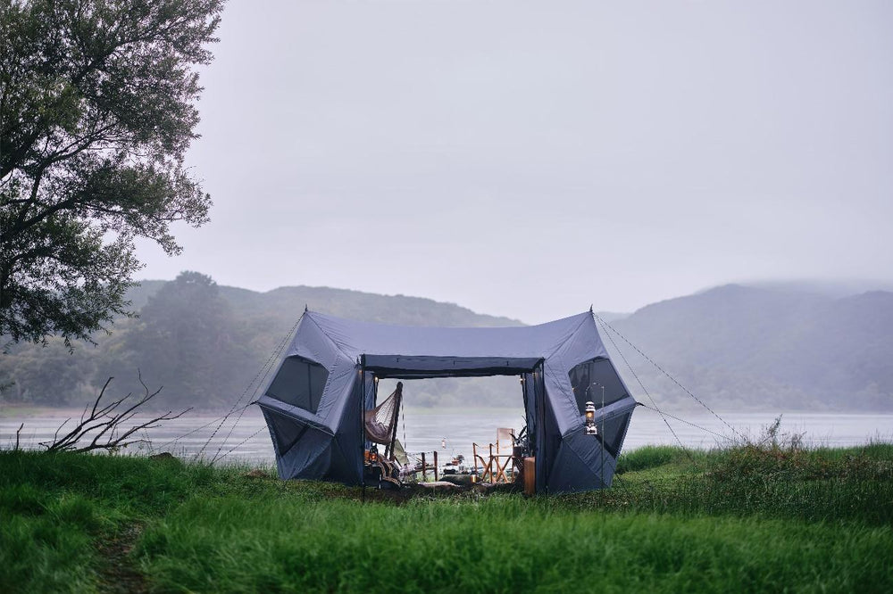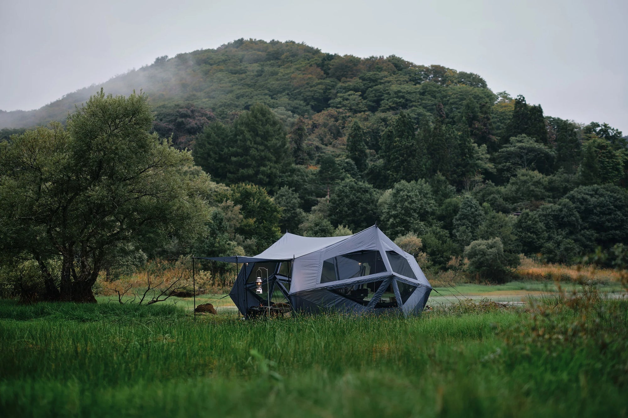 The TOKYO CRAFTS GRAHUS Shelter blends architectural form with functional design. High ceilings, outward-flared sides, and large windows create a spacious interior that feels open and connected to its surroundings. Built with durable materials, tested wind resistance, and practical details like adjustable panels, ventilation points, and an inner roof, the GRAHUS is designed for group camping in all seasons.