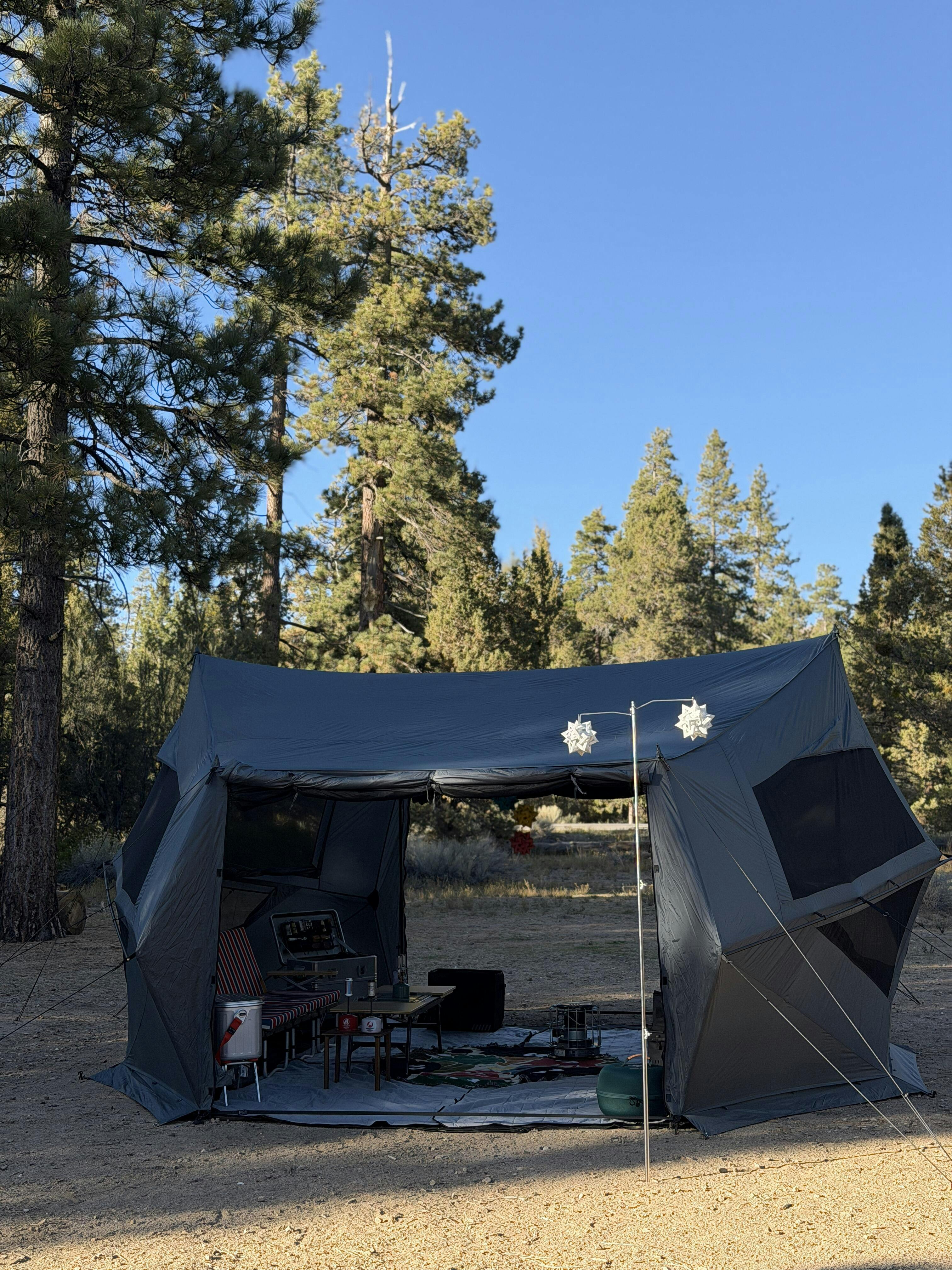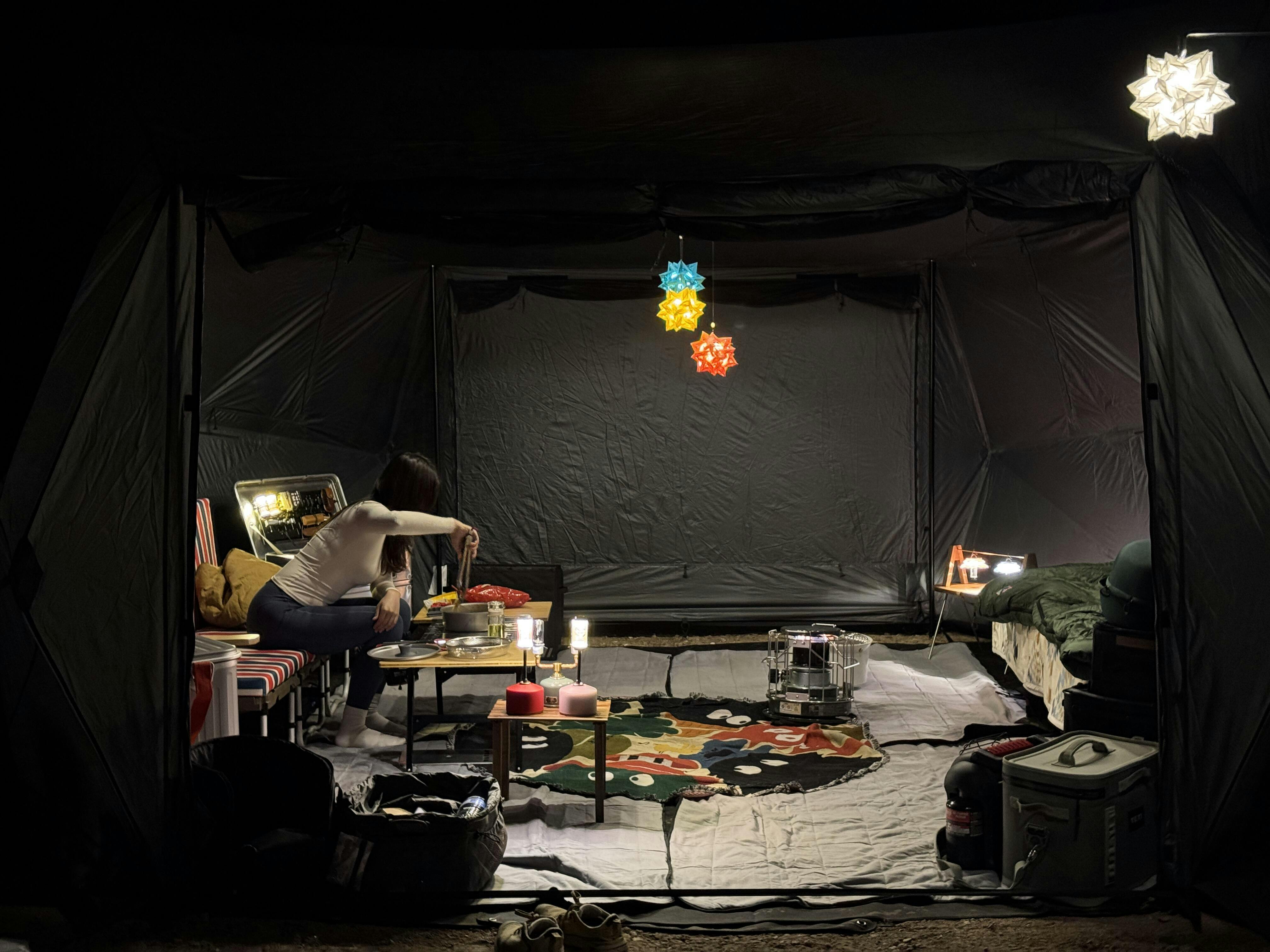 The TOKYO CRAFTS GRAHUS Shelter blends architectural form with functional design. High ceilings, outward-flared sides, and large windows create a spacious interior that feels open and connected to its surroundings. Built with durable materials, tested wind resistance, and practical details like adjustable panels, ventilation points, and an inner roof, the GRAHUS is designed for group camping in all seasons.
